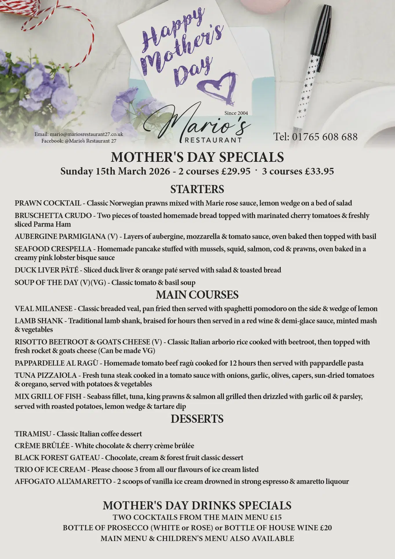 Set in the heart of Ripon, North Yorkshire in the shadow of the magnificent Cathedral, Mario’s Restaurant welcomes you to sample our menu inspired by family, friends and the ingredients sourced locally and from our amazing suppliers in Italy