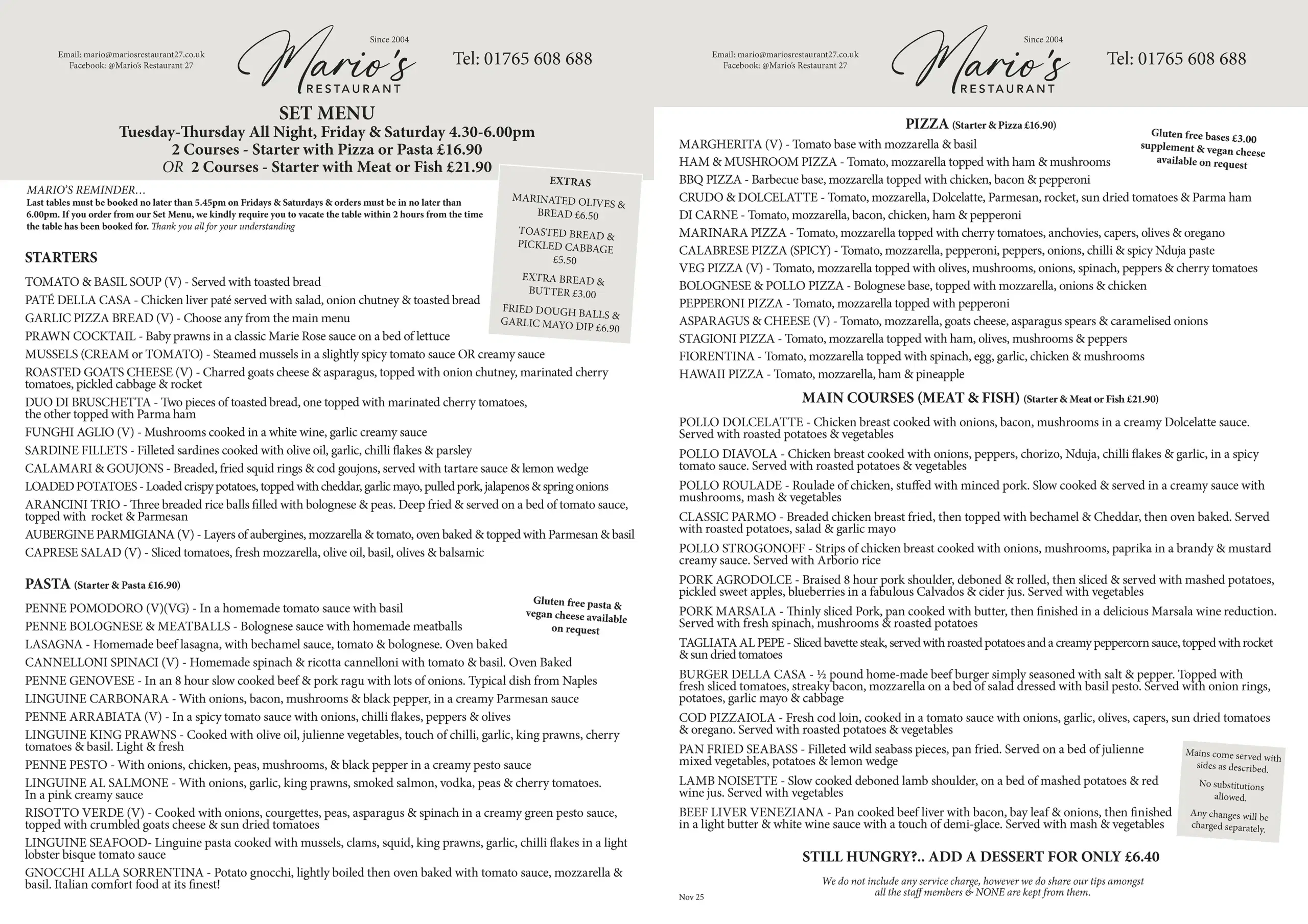 Order from our A la Carte menu and get a 10% discount then collect your order from the restaurant on Kirkgate. To place your order, call 01765 608 688
